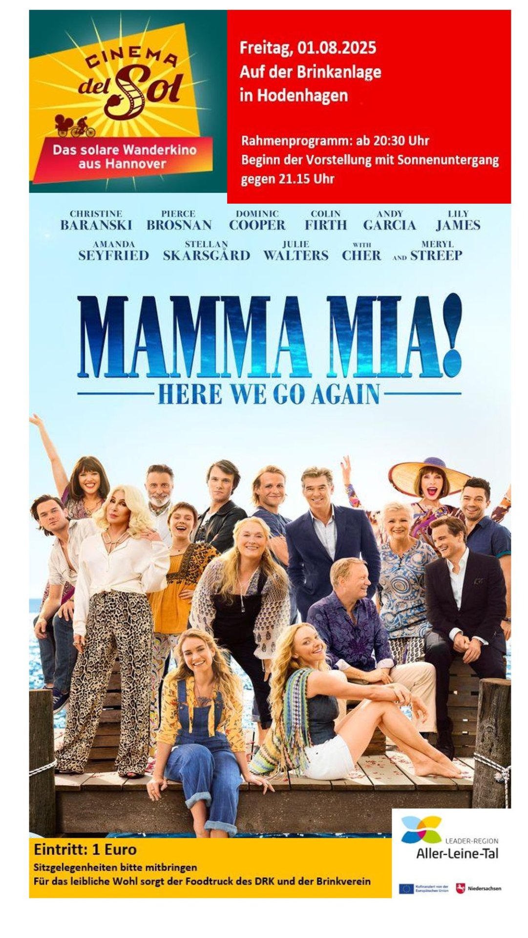 Hodenhagen – Bereits zum fünften Mal lud die Samtgemeinde Ahlden am 1. August zum traditionellen Open-Air-Kino „Cinema del Sol“ auf die idyllische Brinkanlage in Hodenhagen ein.
