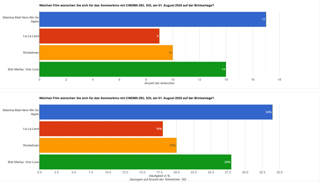 Das Ergebnis der Abstimmung für das diesjährige Cinema del Sol steht endlich fest. Von den abgegebenen Stimmen hat sich "Mamma Mia - Here we go again" in diesem Jahr durchgesetzt. Wir freuen uns auf einen schönen Abend beim Cinema del Sol.